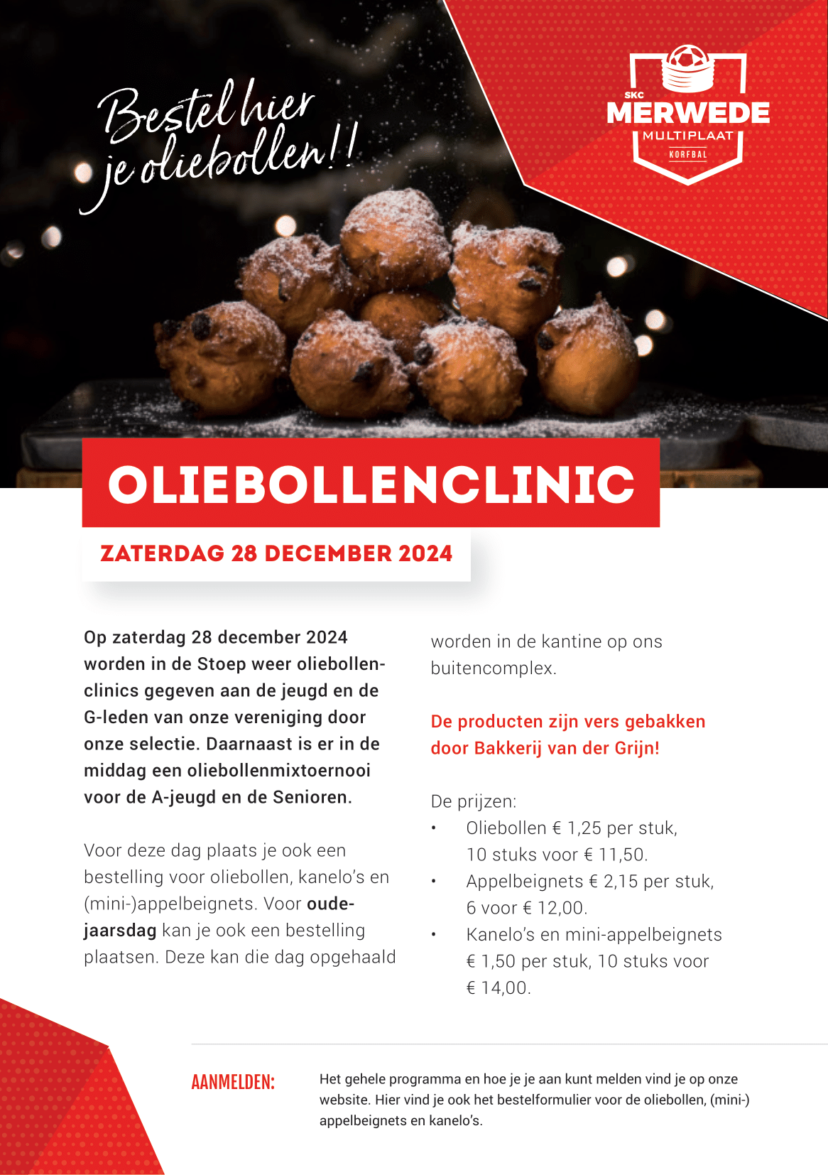 Op 28 december worden er in de stoep weer oliebollenclinics gegeven aan de jeugd en de G-leden van onze vereniging. In de middag wordt er voor de A-jeugd en de senioren een oliebollenmixtoernooi georganiseerd.